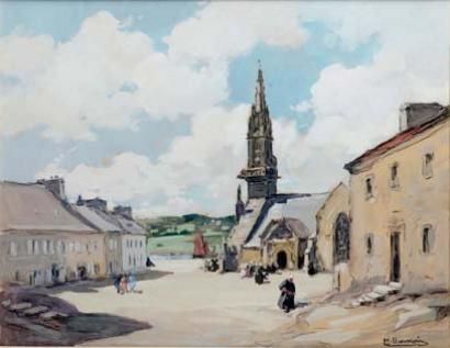 BRETAGNE, PLACE ANIMÉE DEVANT L'ÉGLISE