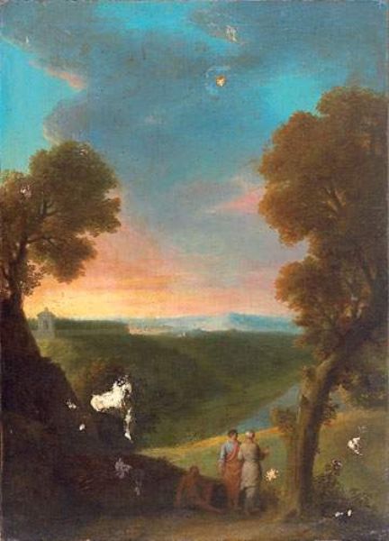 | Personnages vêtus à l'antique devant un paysage de rivière | |