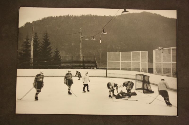 | Action d'un match de hockey sur glace avec l'équipe du Japon, sur une patinoire en plein air | |