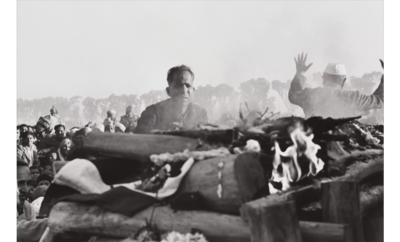 | Gandhi's secretary watches the first flames of the funeral pyre, Delhi, India | |