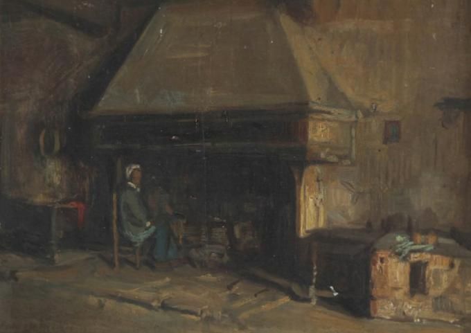 Farmer's interior with man seated near the fireplace