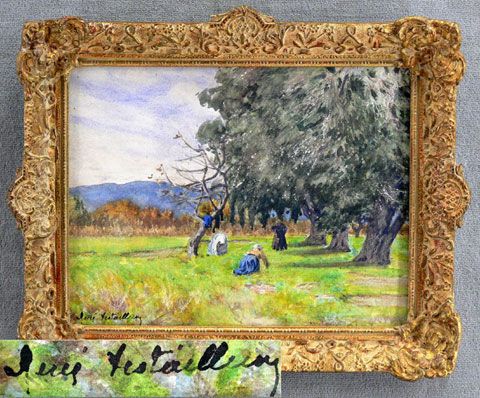 2 Frauen suchen auf einer Wiese unter hohen Bäumen im Gras
