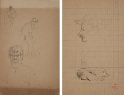 Etude d'un chien et d'un visage d'homme de profil, études d'un homme barbu