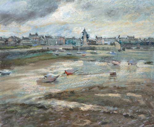 Blick auf eine Stadt an einem Gewässer, im Mittelgrund Boote