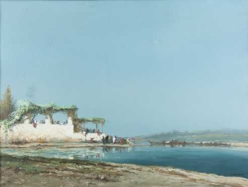 North African seashore scene with figures in kaftans sitting on the shore by a villa