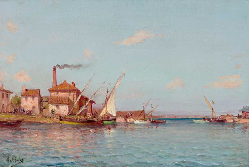 Südliche Küstenlandschaft mit angelegten Booten und Ziegelei.