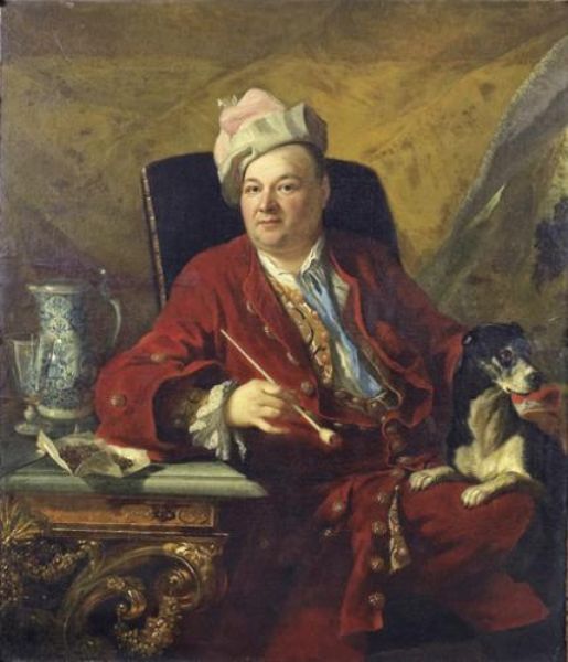 PORTRAIT D'HOMME ASSIS DANS UN INTÉRIEUR AVEC SON CHIEN