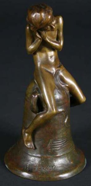 A Golden Brown Patinated Art Nouveau Bronze Bell surmounted by the figure of a boy