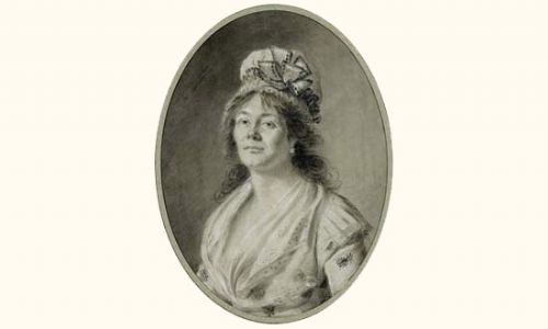 Portrait de femme en buste coiffée d'un bonnet tuyauté à ruban