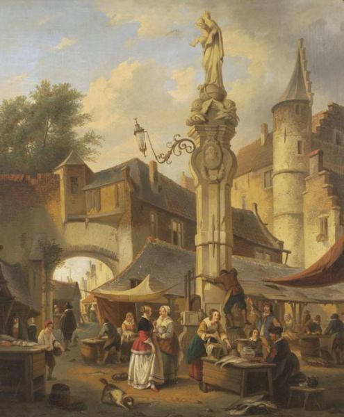 | European market scene with numerous figures about a city square | |