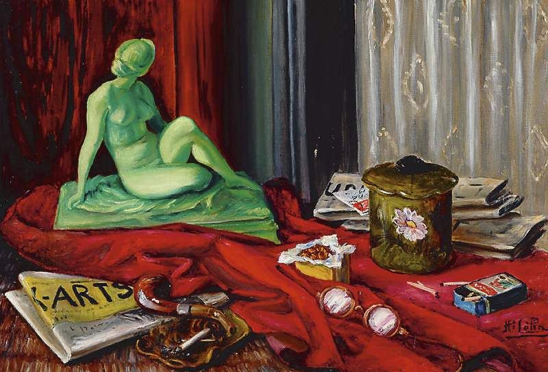 Stilleben mit Figur, Pfeife, Brille und Zeitungen