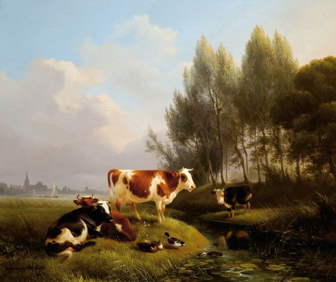 | Cows and ducks on the waterside, to the left a city in the distance | |