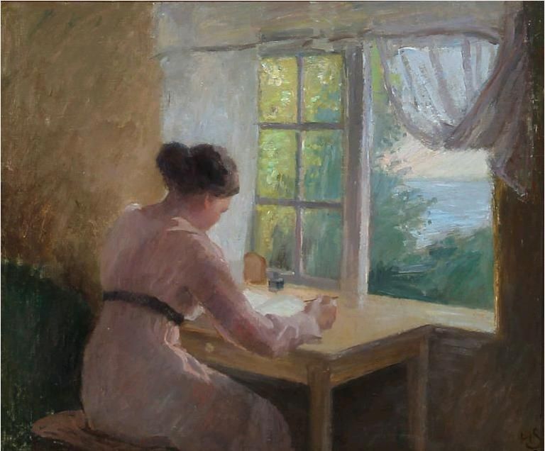 | Interior with a girl writing at a window with a view to a summer landscape | |