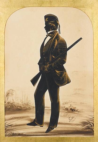 | A silhouette of a Scottish Gentleman, full-length, profile to the left, wearing shooting jacket, waistcoat, trousers and Glengar | |