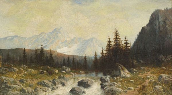 H.A. ELKINS, WESTERN LANDSCAPE WITH DEER