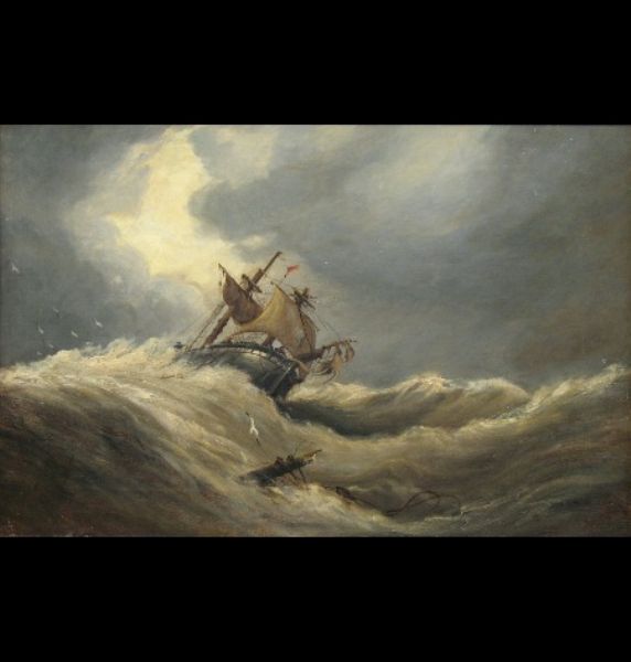 | sailing ship with figures on the deck floundering in a rough sea | |