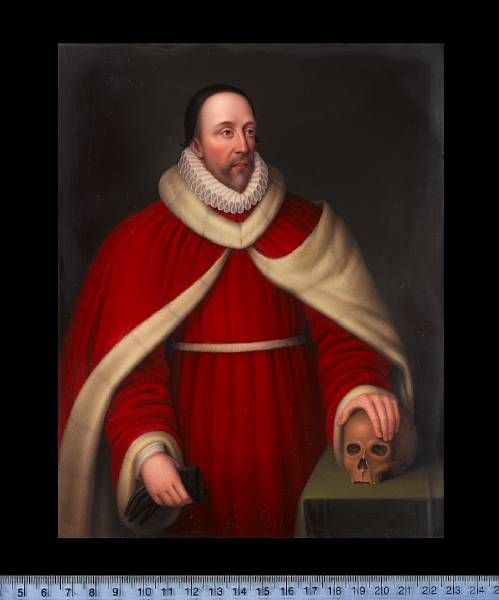 | Edward Coke (1552–1634), wearing white fur trimmed red robes, ruff and black cap, he holds his gloves in his right hand, his lef | |