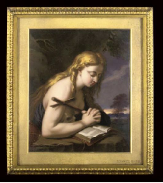 | Mary Magdalene, in prayer at a rock reading the Bible, her hands clasping a crucifix, a skull tucked under her right arm, an inc | |