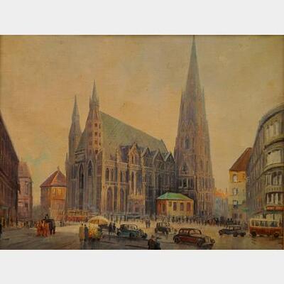 Henry Brockmuller (German 20th c.)- ''Stephansdom''- oil on canvas, 1948, signed Henry Brockmuller lower right, signed and titled verso. 18 1/2 x 22 1/2'' | |