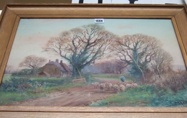 | Sheep and shepherd on a country lane; Horse and cart on a country lane | |