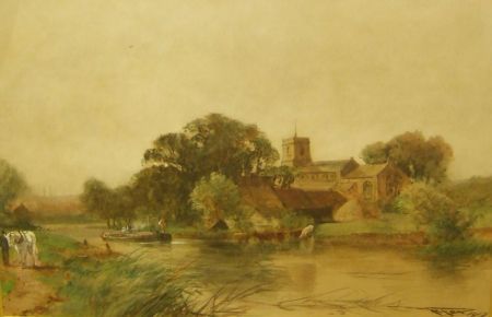 Summer River Landscape with Figures, Barge and Animals by a Church