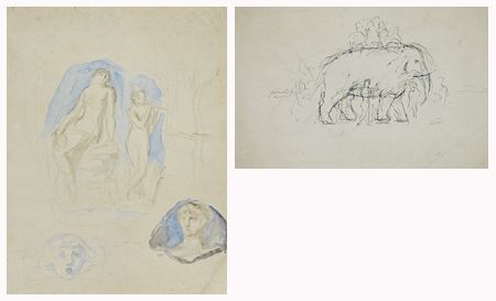 1) Croquis de scène antique, 2) Eléphant