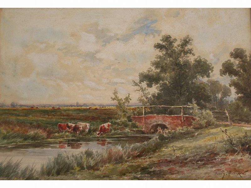 CATTLE WATERING BY A COUNTRY BRIDGE