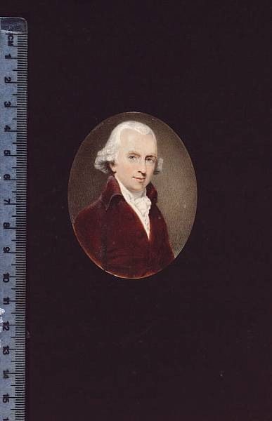 A Gentleman, wearing burgundy coat, white waistcoat and frilled chemise, his hair powdered