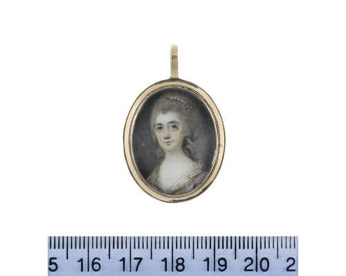 | A Lady, wearing pink dress, white gauze fichu with red and gold spot embroidery, white lace slip, her natural wig dressed with a | |