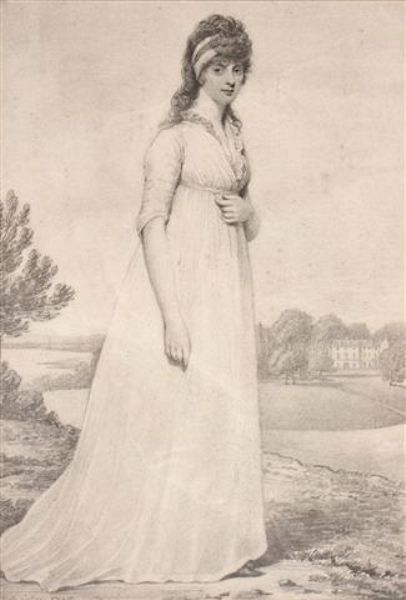 Full length portrait of a young lady in the extensive grounds of a country house