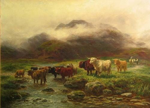 Highland cattle at a stream