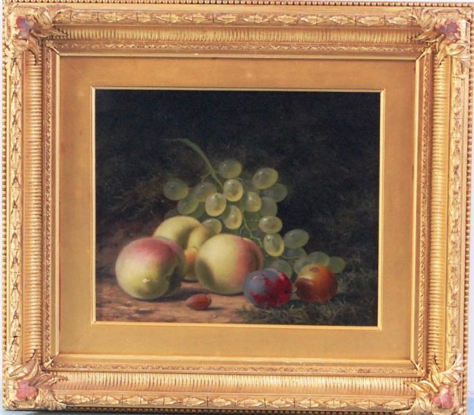 | Still life with peaches and grapes on a mossy bank | |