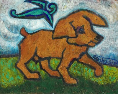 Den glade hund (The happy Dog). Signed Heerup 65. Oil on masonite. 48×61 cm. | |