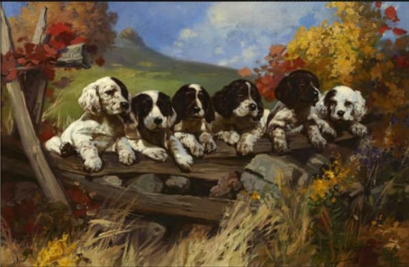 Six puppies on a fence