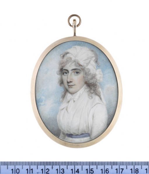 | A Lady, wearing white dress, fichu and neck tie, blue sash, a white turban in her powdered hair. | |