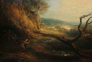 Brigands lying in way for a stagecoach in a wooded mountain landscape