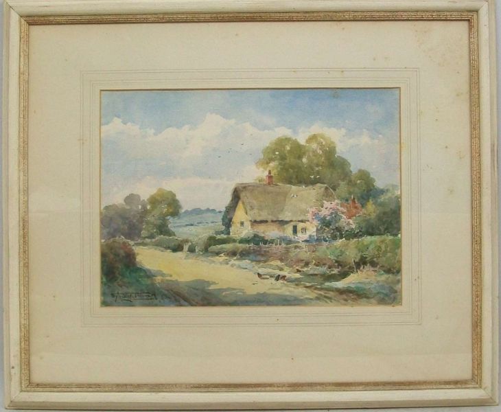 | A thatched cottage, with chickens in the lane to the foreground | |