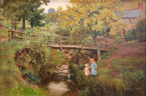 | 'Young Anglers' (Two Children fishing on a River Bank near a Wooden Bridge and Cottage) | |