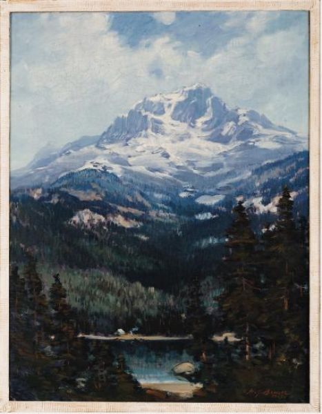 VIEW OF A WESTERN MOUNTAIN PEAK AND LAKE.