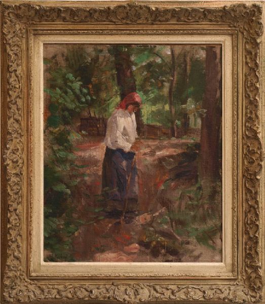 Bildnis einer bäuerlich gekleideten Frau im lichtdurchfluteten Laubwald