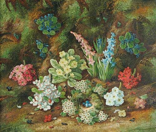 | A still life, a birds nest amidst primroses and other flowers against a mossy background | |
