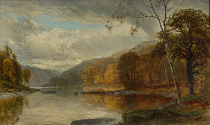 Herbstliche Seenlandschaft bei bewölktem Himmel.