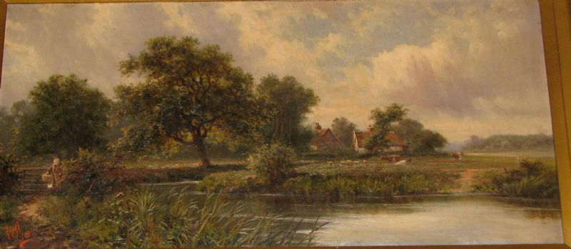 depicting girl carrying basket on riverbank with cottages on opposite bank