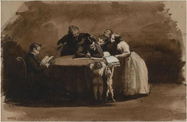 L'écrivain à sa table de travail entouré de sa famille