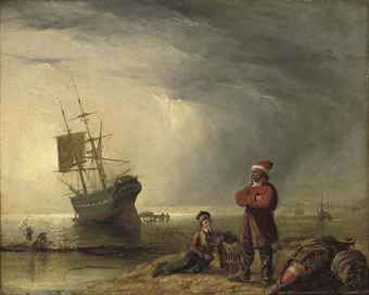 | A beached brig at low tide with fishermen on the foreshore | |