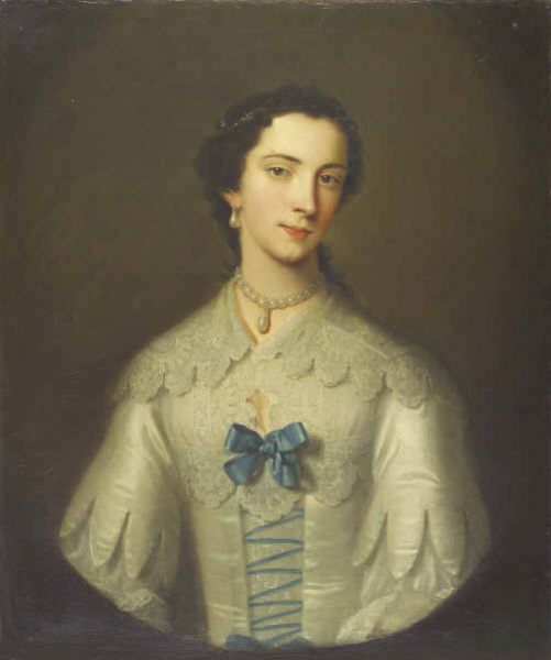 | Portrait of an Elegant Lady, half length, wearing a cream satin and lace dress with blue ribbons | |