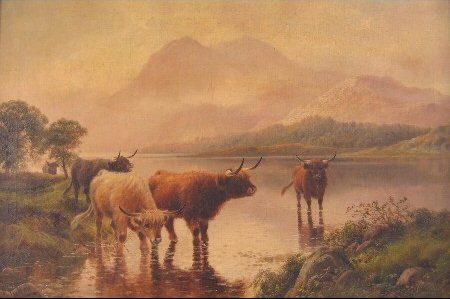 | Highland cattle drinking, Loch Katrine, mountains in the distance | |