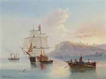 | A trading schooner in a calm off Whitby with a paddlesteamer off her starboard beam | |