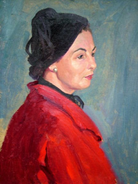 Portrait of a lady, head and shoulders turned to the right, in a red coat