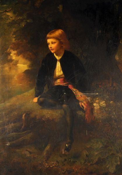 | Portrait of Lawrence Challoner Garratt, aged five years six months, seated cross legged in a river landscape, wearing a velvet s | |
